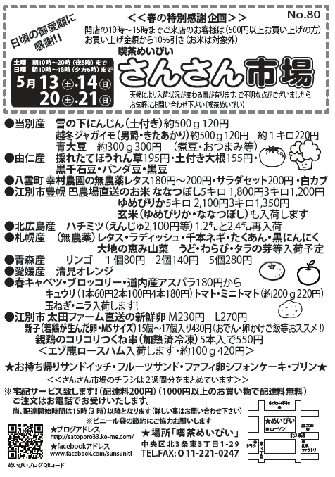 5月13日と14日、20日と21日のさんさん市場のチラシです