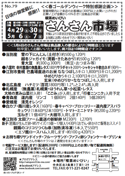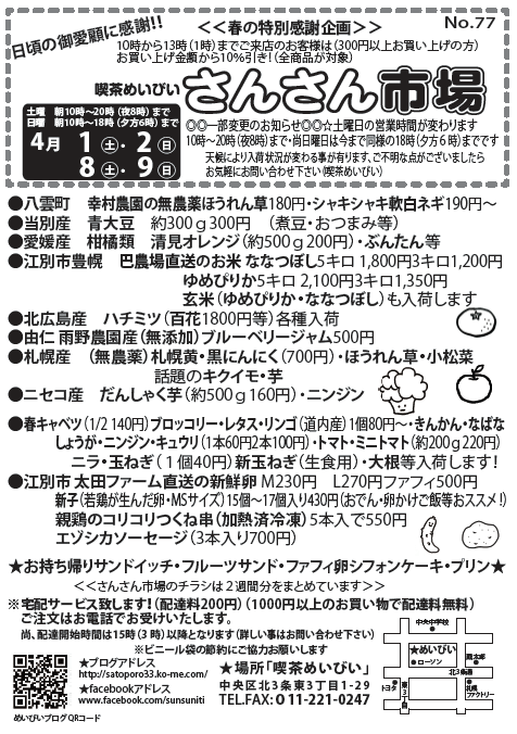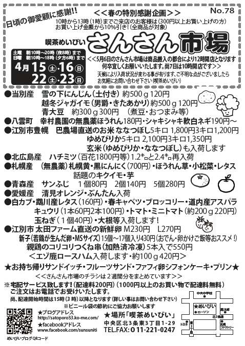 4月15にち16日、22日と23日のさんさん市場のチラシです